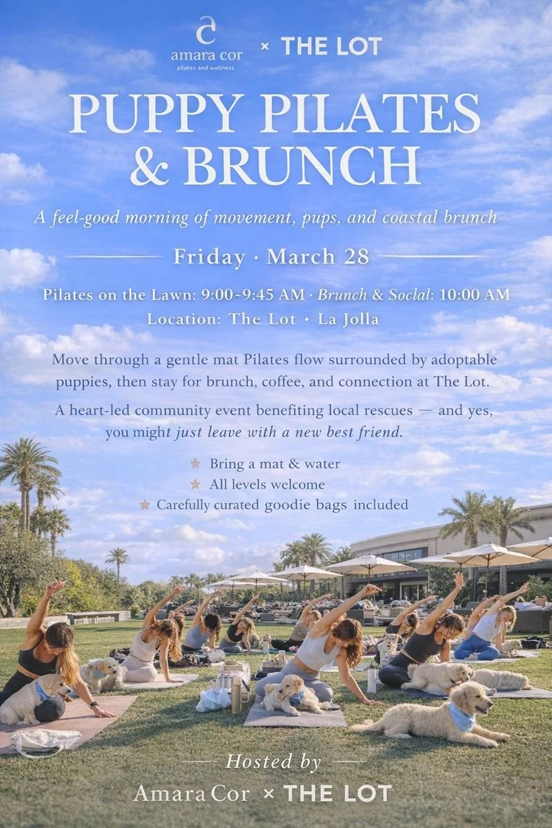 Join us on March 28 for a feel-good Pilates + brunch + wellness social you won’t forget. Enjoy a light mat Pilates class with adoptable puppies by your side, followed by brunch, refreshments, and time to connect with our community in a relaxed outdoor setting.